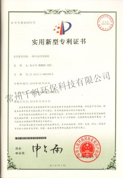 實用新型專利證書 一種中水回用系統