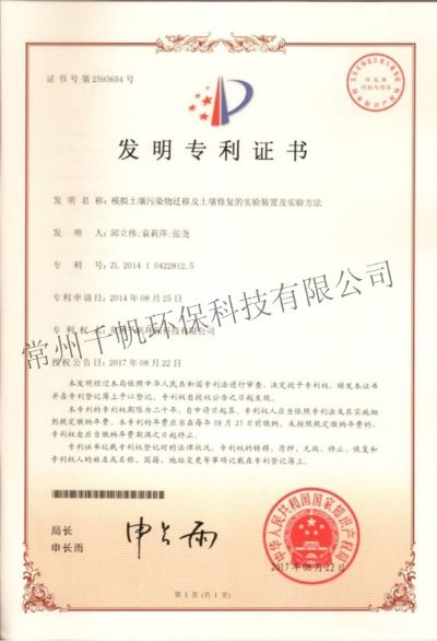 發明專利證書 模擬土壤污染物遷移及土壤修復的實驗裝置及實驗方法