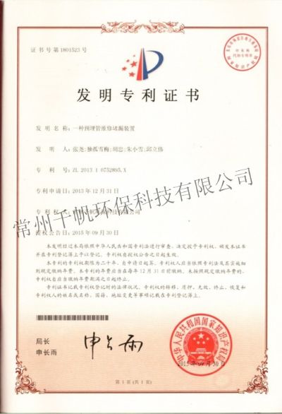 發明專利證書 一種預埋管維修堵漏裝置