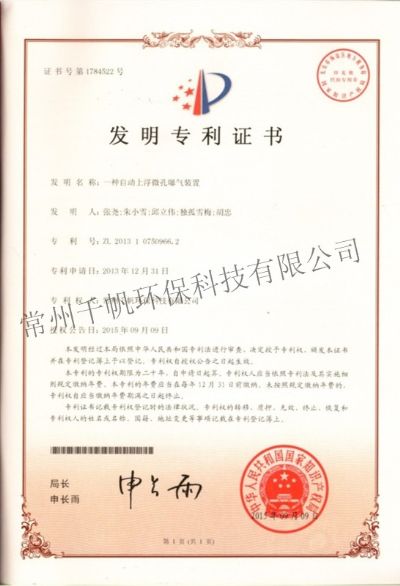發明專利證書 一種自動上浮微孔曝氣裝置