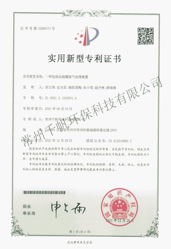 實用新型專利證書 一種用于處理含塵有機廢氣的一體化裝置