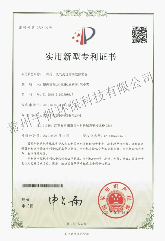 實用新型專利證書 一種用于廢氣處理的高效除霧器