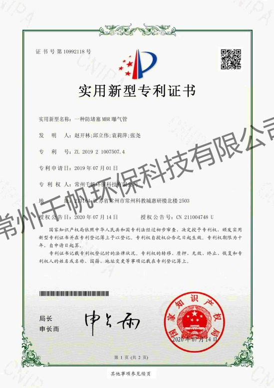 實用新型專利證書 一種防堵塞MBR曝氣管