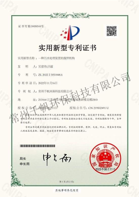 實用新型專利證書 一種污水處理裝置的攪拌機構